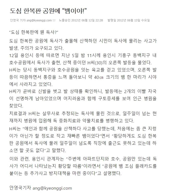 This news said that a venomous snake (probably a viper) bit a 30 year old man during a walk in a lake park situated in Yong-in, S.Korea. This park is located in an urban place surrounded by apartments so it is quite odd for a snake to appear there. This place is not far away from my house.